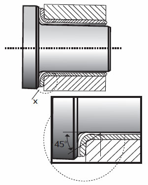 關(guān)于翻邊套,從翻邊套口到軸向轉(zhuǎn)換組件必須考慮半徑的轉(zhuǎn)變,切面要有—個(gè)足夠大的倒角。以防翻邊套口聚集污垢后仍然可以支持軸向載荷部件的邊緣。